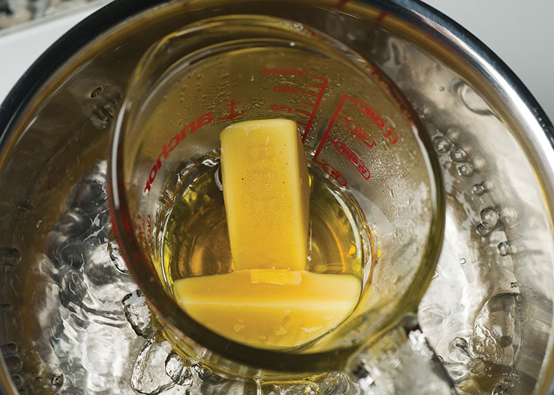 Melt beeswax in a double boiler or small, glass measuring cup set in pan a of boiling water. Beeswax is flammable and should never be placed in pot directly on flame.