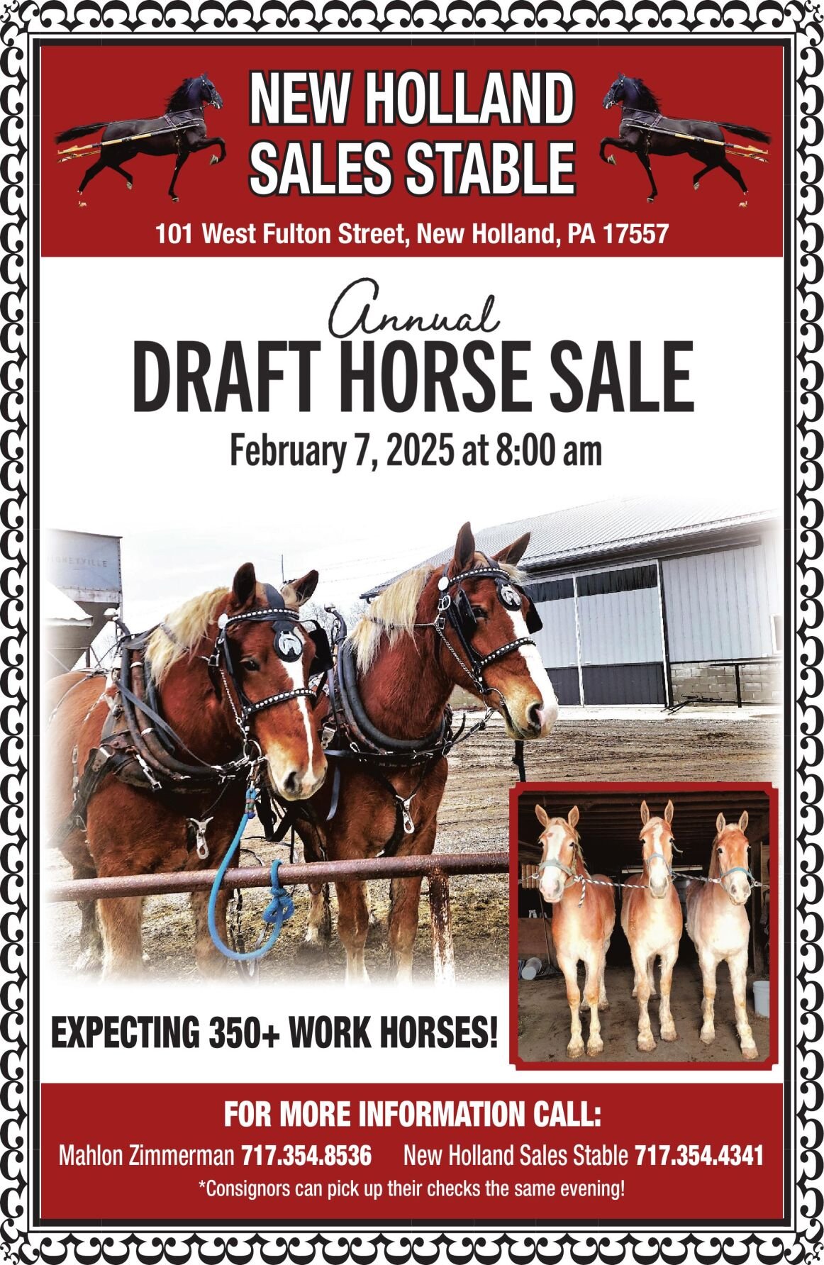 NEW HOLLAND SALES STABLE 101 West Fulton Street, New Holland, PA 17557 EXPECTING 350+ WORK HORSES! FOR MORE INFORMATION CALL: Mahlon Zimmerman 717.354.8536 New Holland Sales Stable 717.354.4341 *Consignors can pick up their checks the same evening!