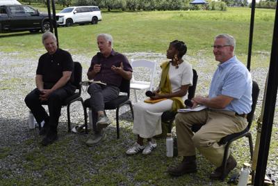 U.S. ag secretary Tom Vilsack, right, and Pennsylvania ag secretary Russell Redding field questions from the media at the Rodale Institute's annual field day on July 19, 2024.